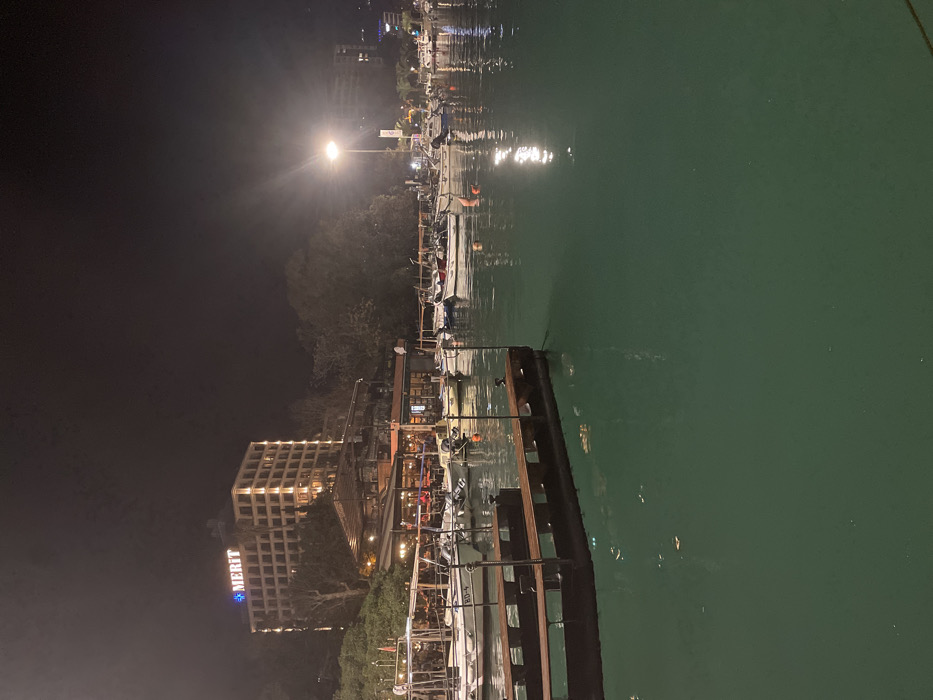 night scene with a body of water reflecting light. A pier with boats is visible, illuminated by artificial light. A tall building with the word "MERIT" is seen on the left. The scene suggests a waterfront setting with nighttime activity and building lights reflecting on the water. The atmosphere is dark except for the artificial lighting.