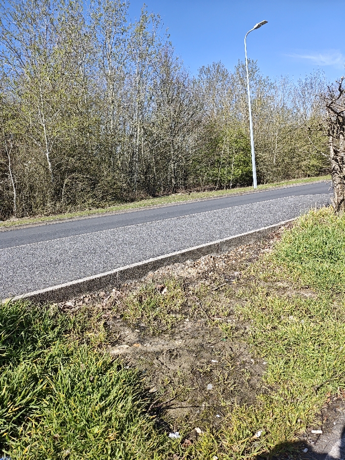 The image displays an outdoor scene under a clear blue sky. A two-tone asphalt road or path, featuring a darker grey strip alongside a lighter grey aggregate surface, traverses the middle ground diagonally from lower left to upper right. This road is separated by a concrete curb from a narrow verge composed of dark grey aggregate and brown leaf litter. Beyond the road, a dense treeline of deciduous trees with nascent light green leaves forms a background, indicating early spring foliage. A tall, slender silver-colored streetlamp with an LED-style luminaire stands on the right side of the road, positioned in front of the trees. The immediate foreground consists of patchy green grass interspersed with areas of exposed, dark, damp earth or mud, particularly centrally. Several white cigarette butts are visible scattered on the ground in the foreground grass and bare earth. No individuals or vehicles are present. The location is in Uttlesford, United Kingdom.
