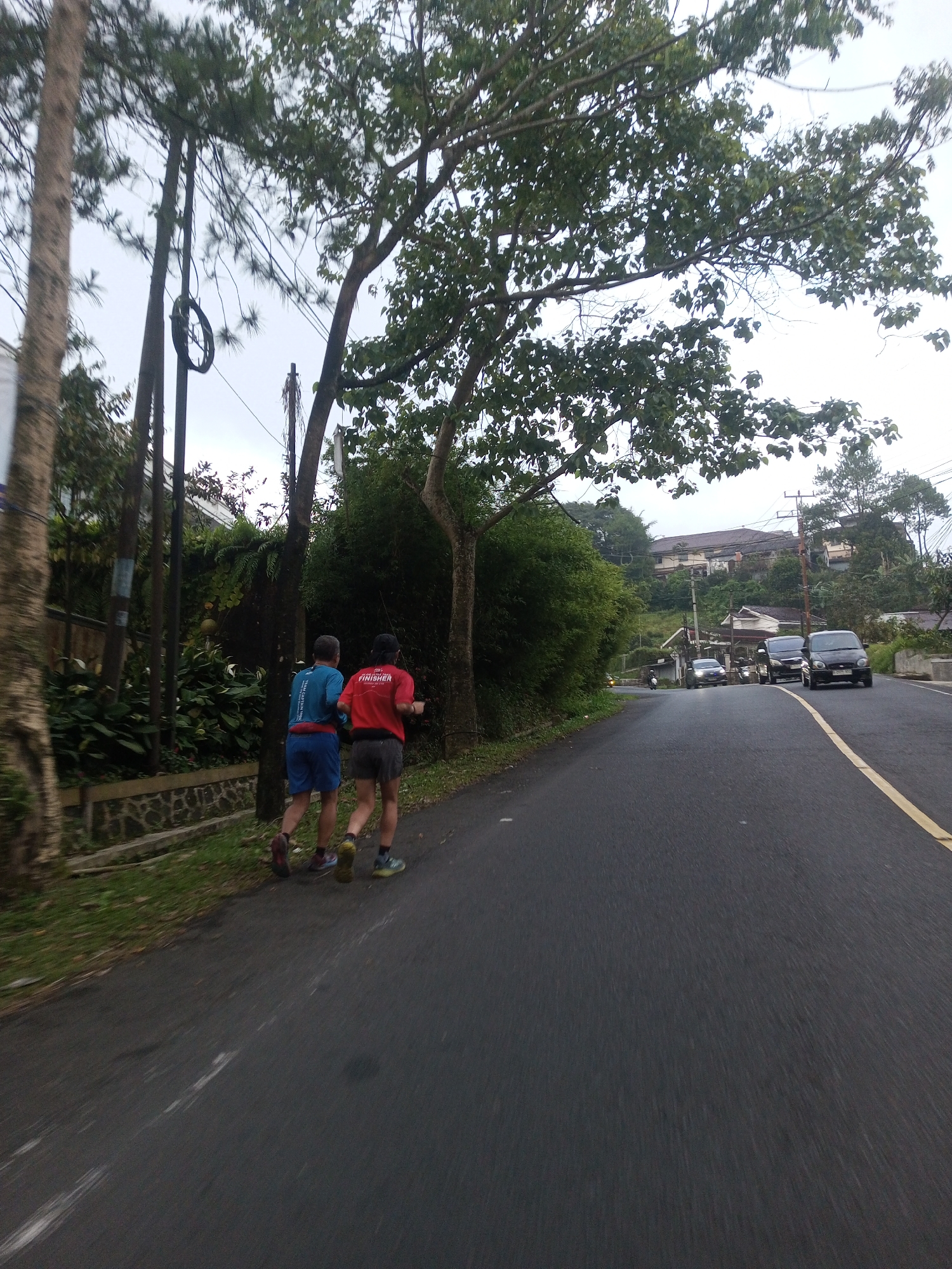 Two runners are jogging along a paved road with a yellow dividing line. One runner is wearing a blue shirt and blue shorts, while the other is wearing a red shirt with "FINISHER" printed on it and gray shorts. A low stone wall and greenery line the left side of the road, with trees and utility poles in the background. Cars are visible further down the road. The location is Taunggyi, Myanmar, based on the foliage and architecture.