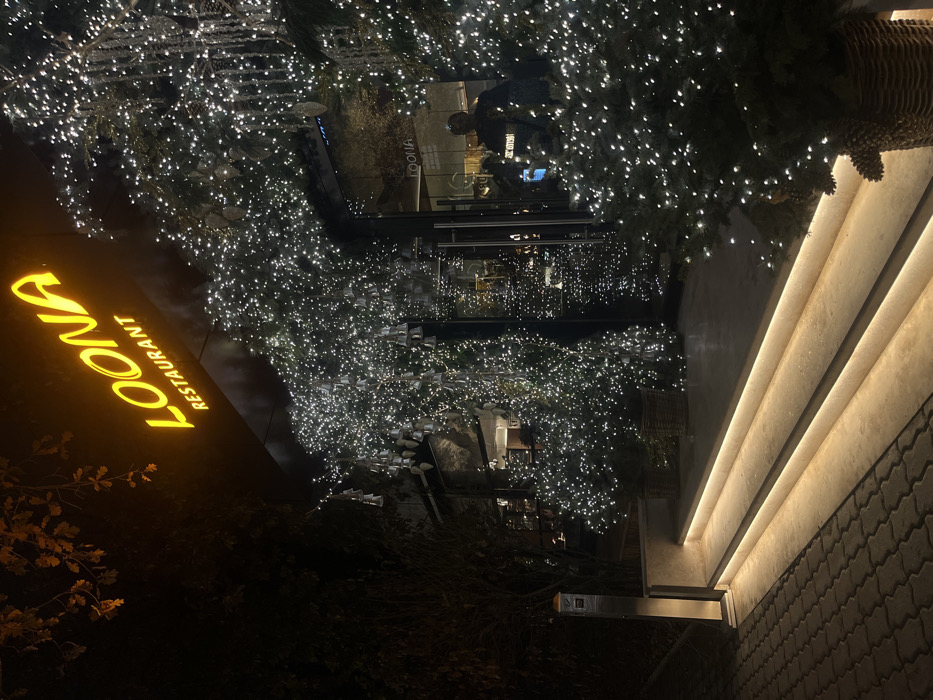 The scene depicts the exterior of "LOONA RESTAURANT" at night in Yerevan, Armenia. A prominent, illuminated orange sign displays "LOONA RESTAURANT" above the entrance. The building facade and surrounding trees are extensively decorated with numerous white string lights, creating a festive appearance. Decorative, bell-shaped or conical ornaments hang among the lights. The entrance features modern glass doors, reflecting interior lighting and a dark, humanoid silhouette, likely a person. Three steps lead up to the entrance, each illuminated from beneath its leading edge by a horizontal strip light. Two potted evergreen trees, adorned with white lights, are visible in wicker baskets on either side of the entrance, near the steps. A light-colored, rectangular post with an illuminated top stands to the left of the steps. The ground in the foreground is a paved sidewalk of interlocking pavers. Dark foliage and tree branches, some with visible autumn leaves, are present on the left and upper left portions of the image.