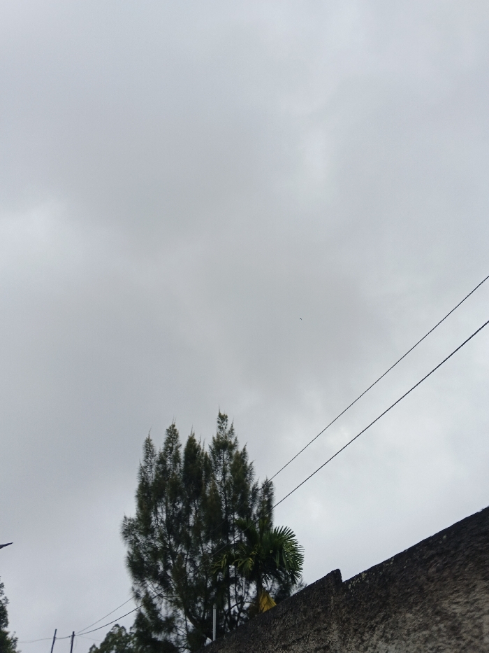 The image depicts an overcast sky dominating the upper two-thirds of the frame, uniformly grey with no direct sunlight visible. A tall, slender coniferous tree stands prominently in the lower-left to mid-center, its dark green foliage extending towards the top of the frame. To its right, partially obscured by the coniferous tree and a wall, is a smaller palm-like tree with distinct green fronds. A textured concrete or stone wall, dark grey in color and appearing weathered, occupies the bottom right quadrant, extending horizontally and diagonally upwards. Two dark utility lines run diagonally across the sky from the upper right, passing above the trees and the wall. A single, small, dark, indistinct object, possibly a bird, is visible high in the sky slightly to the right of the image's vertical center. A small yellow object is partially visible behind the palm tree, positioned near the top of the wall. No individuals are present. This scene is located in Alta Floresta, Brazil.
