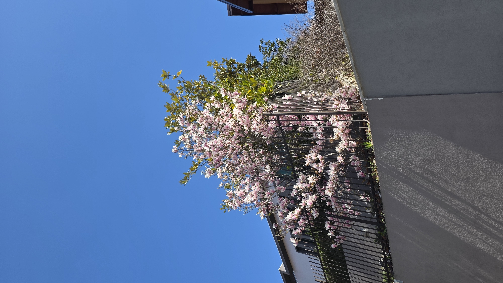 A slightly rotated outdoor shot depicts a flowering tree with pink blossoms spilling over a dark metal fence