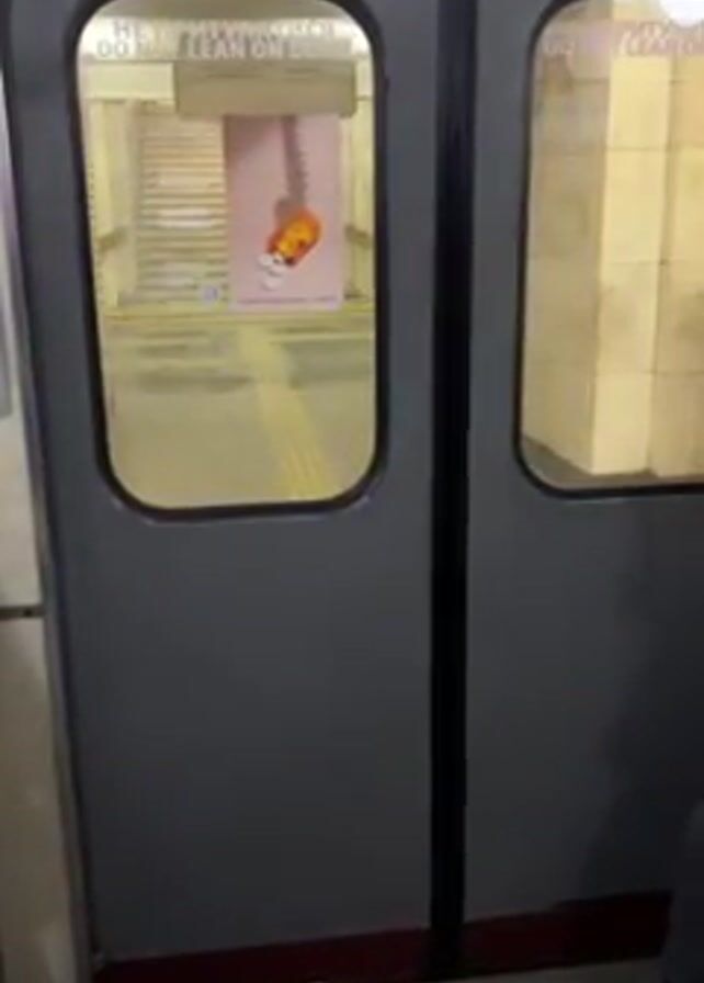 The camera is positioned inside what appears to be a train, focusing on a partially open door. The door consists of two panels, one gray with a rounded rectangular window and the other a full-length glass panel. The view through the door reveals a station platform with tactile paving and tiled walls. An advertisement featuring an image of a person and an object is visible through the window of the door. The camera is stationary, and the only discernible action is the partially open door. The person in the train carriage is cut off at the bottom, so their features cannot be seen.