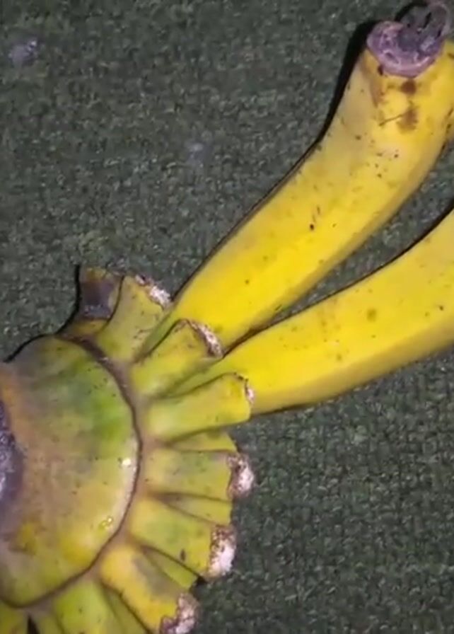 Two ripe bananas are still attached to the cut stem on a patch of green artificial turf. A hand and a small, partially visible cardboard box appear briefly in the corner of the frame.