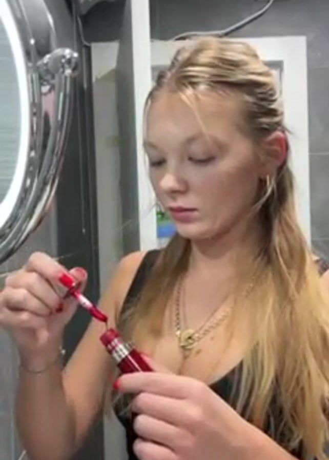 A young woman with long blonde hair is applying red lip gloss in a bathroom