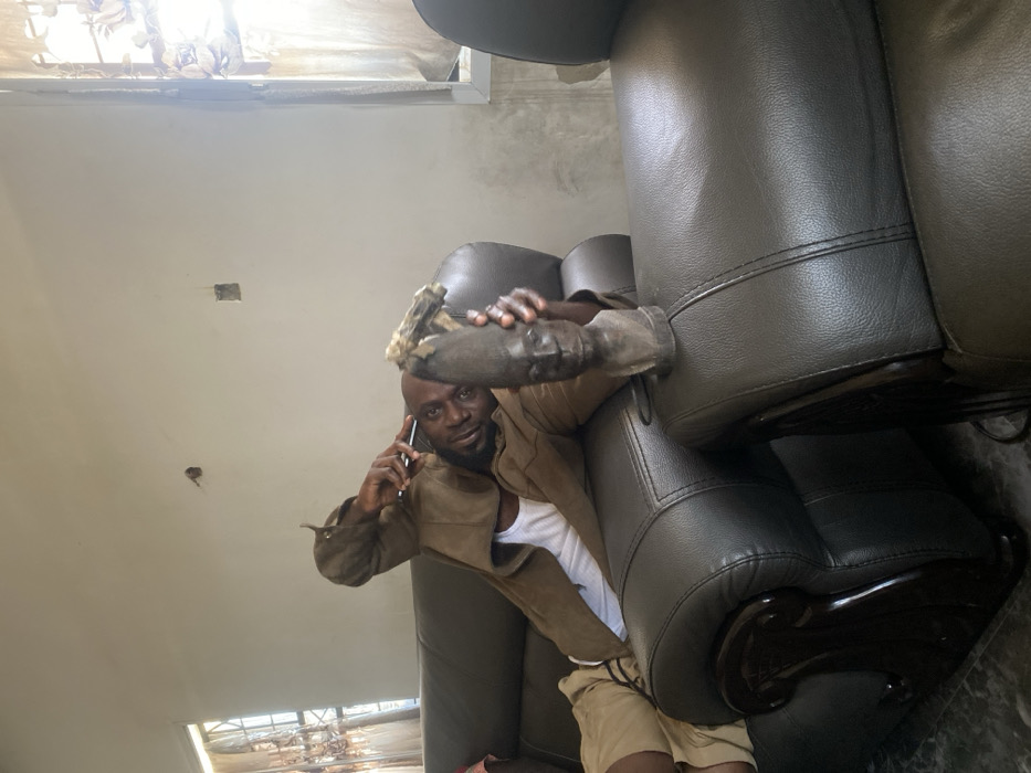 An adult male is observed reclining on a dark leather sofa within an indoor setting in Jos, Nigeria. He is dressed in a white undershirt, a brown jacket, and light-colored shorts. His head is bald, and he has a beard. He is smiling and looking towards the camera. With his left hand, he holds a small, reflective silver object, possibly a smartphone or razor, near his head. His right hand supports a dark wooden sculpture, approximately 25 cm tall, featuring a stylized human head with an elongated headdress and prominent facial features. The sculpture rests on the armrest of an adjacent dark leather sofa in the foreground. Some light-colored fibrous material is affixed to the top of the sculpture's headdress. The room's walls are light-colored, exhibiting minor surface imperfections, including a small hole and a rectangular cutout. Two windows are visible; one on the left with a patterned curtain and metal grille, and another larger window on the right partially covered by a light, sheer curtain. Bright natural light enters the room from the right. The floor appears dark.