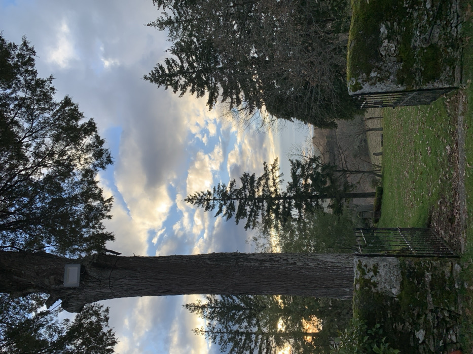 The scene depicts an outdoor landscape in Macedo de Cavaleiros, Portugal, viewed through an open, dark metal gate. The gate, composed of vertical bars, is framed by low stone walls heavily covered in green moss. Beyond the gate, a manicured green lawn with scattered brown leaves extends into the midground. A large, thick-trunked tree dominates the left side of the frame, extending from the bottom to near the top. Attached to its trunk, approximately one-third of the way up, is a light-colored, rectangular electronic device, potentially a security camera or light fixture, with visible wiring. Several tall conifer trees stand in the midground and background, alongside other deciduous trees, some appearing bare. To the left of the central tall conifer, a dark, upright stone monument or marker is visible in the grassy area, suggesting a cemetery or memorial site. The background features rolling hills or fields under a partly cloudy sky. The sky shows patches of blue interspersed with white and grey cumulus clouds. A warm, golden light, consistent with either sunrise or sunset, is visible on the far left horizon and illuminates some clouds. No individuals or animals are present.