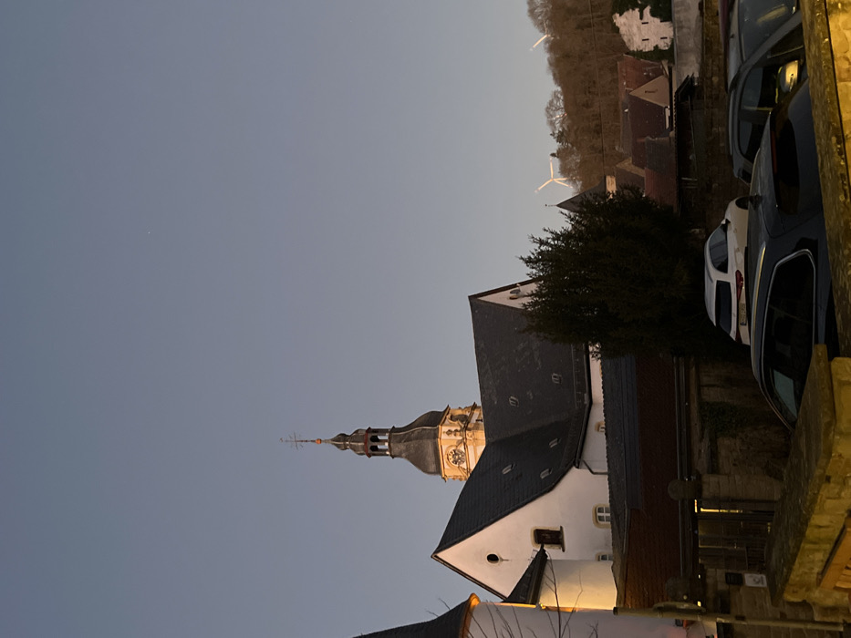 The image depicts an urban landscape in Meisenheim, Germany, during dusk or early evening hours. The prominent central subject is the Schlosskirche, characterized by its white-walled structure and dark, sloped slate roofs. A multi-tiered Baroque-style bell tower with a dark spire, topped by a cross and weather vane, rises from the church's main body. The tower's clock face is illuminated with a warm orange light. To the immediate left, a partial view of another building with a dark, pointed roof and a brightly illuminated light-colored wall is visible. In the midground, a dark green evergreen tree partially obscures a lower building with a reddish-brown tiled roof. Parked vehicles are present in the lower midground, including a dark SUV in the foreground and a white SUV behind it. A low, stone wall, warmly illuminated, runs across the immediate foreground. The background reveals a wooded hill with several modern white wind turbines prominently visible against the darkening sky. Below the treeline, residential structures with reddish-brown roofs can be discerned. The sky is a gradient of dark blue, with a single bright celestial body (a star or planet) visible in the upper right quadrant. No individuals are present, and no actions or interactions are depicted.