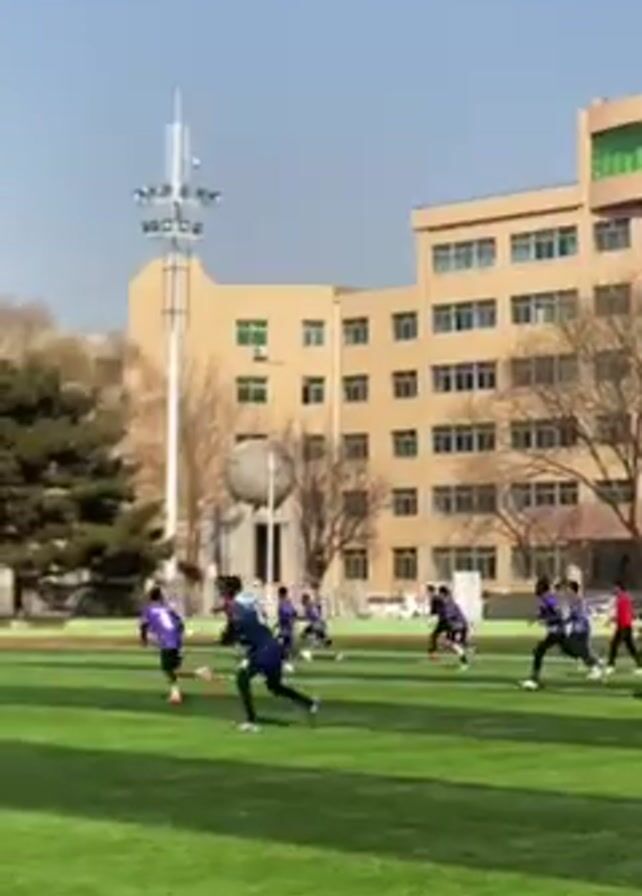 A medium shot depicts a soccer practice on a bright, sunny day. The players, wearing blue and purple jerseys, are scattered across a green artificial turf field, kicking and passing a soccer ball. Some wear white shorts, others black. A large, tan-colored building stands in the background, along with several trees. A tall light post is visible on the left of the frame. The camera follows the action as the players move across the field.