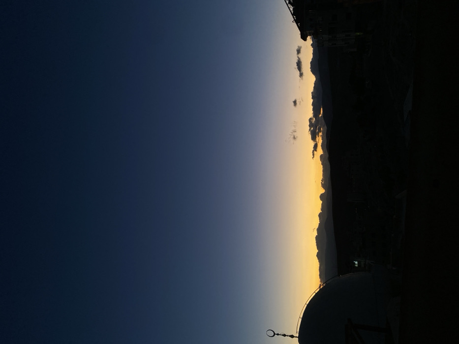 The image displays a panoramic twilight or sunset view over At-Tall, Syria. The sky transitions from a deep indigo at the top to a gradient of orange and yellow along the horizon line. Scattered dark clouds are visible in the mid-sky, particularly above the horizon. In the left foreground, the upper portion of a light-colored, architectural dome is prominently featured, silhouetted against the bright horizon. A crescent moon and star finial, an Islamic symbol, is clearly visible at the apex of this dome. Faint illumination is present on a section of the dome's surface. To the right foreground, a multi-story building, heavily silhouetted, shows an irregular roofline and some structural details. Between the foreground structures and the distant horizon, a dark, indistinct urban landscape unfolds, with a few small, artificial lights discernible within the shadows. The horizon is defined by a silhouetted mountain range. No individuals, explicit actions, or interactions are present in the scene.