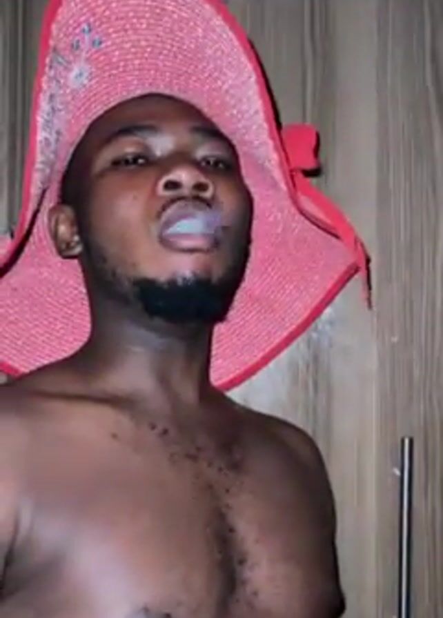 A shirtless man wearing a large red hat is standing in front of a wooden cabinet and exhaling smoke from his mouth