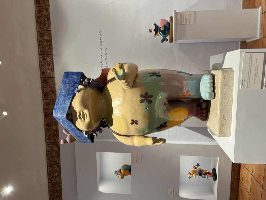 Inside a gallery, a colorful ceramic sculpture of a stout figure stands on a pedestal. The figure wears a blue hat and a flower-patterned garment. Inset wall niches display smaller ceramic pieces. Above the sculpture, handwritten text reads, "Puedo reparar el corazón al que lo formó," which translates to "I can repair the heart to the one who formed it." A nearby sign describes the sculpture as "PASO FIRME," stating "Lo que hay en el centro de tu vida es tu seguridad" or "What is at the center of your life is your security."
