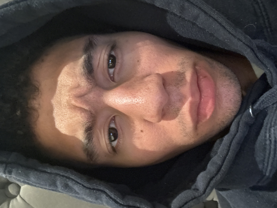 A close-up portrait shows a person with brown eyes, a prominent nose, and full lips. They are wearing a dark hooded sweatshirt. The hood is pulled up around their head, casting a shadow on parts of their face. The person is lying down, and the image is oriented at an angle. The skin appears smooth and slightly shiny, with some visible pores. The background is softly blurred, suggesting a cushioned surface.