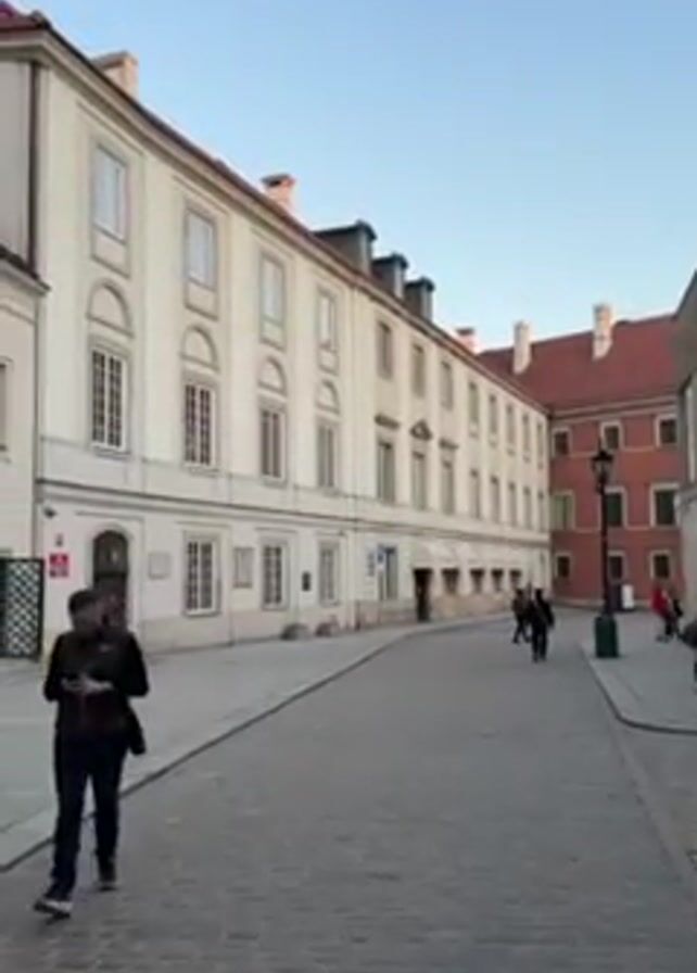 narrow street paved with cobblestones, flanked by buildings with light-colored facades. A person in dark clothing walks toward the camera, looking at a phone. Other people are walking in the distance. A red building with a darker roof is visible further down the street. A lamppost and trash receptacle stand next to the red building. The sky is a clear blue.
