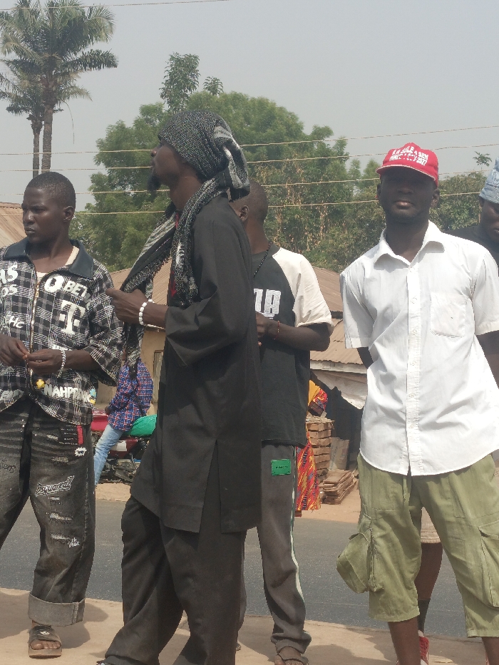 The image depicts an outdoor scene in Ube, Nigeria, featuring six African males standing in a group during daylight hours