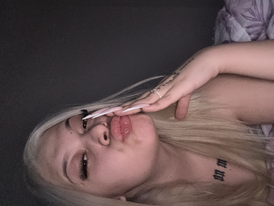 A young female with long, straight, bleached blonde hair is depicted from the upper torso, centered in a close-up, dimly lit indoor photograph
