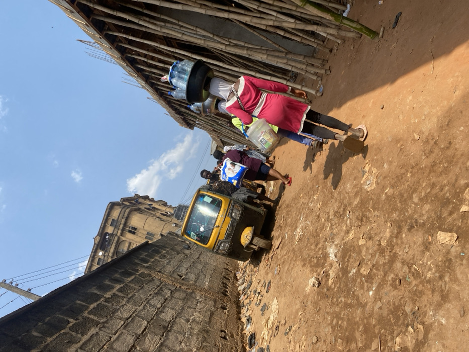 The image depicts a crowded, unpaved dirt path in Onitsha, Nigeria, under a bright, clear sky with sparse clouds. To the left, a weathered cinder block wall lines the path, with scattered refuse at its base. To the right, a tall, temporary construction structure composed of numerous bamboo poles stands parallel to the path. A yellow three-wheeled auto-rickshaw (Keke Napep) is positioned in the middle-ground on the left side of the path, its windshield reflecting sunlight. Several individuals are walking along the path, primarily away from the camera. In the foreground, a person wearing a pink tunic, dark leggings, and a white headscarf carries a black basin filled with multiple plastic water bottles balanced on their head. Immediately behind them, another individual in a light green top carries a clear plastic container. Further back, a person in a maroon top carries a light blue bag, and a man in a patterned shirt stands near the tricycle. In the distant background, an older, multi-story building with arched windows is visible. Sunlight casts distinct shadows on the reddish-brown dirt path.