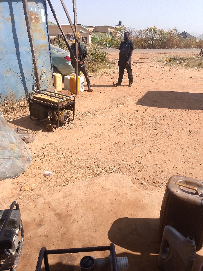 An outdoor scene in Reifild-Ist, Nigeria, depicts an arid, dusty environment under direct sunlight. The ground is reddish-brown dirt, showing signs of vehicle tracks and scattered debris. In the foreground, partially visible in the lower left, is a crumpled transparent plastic sheet. A black-framed generator is visible near the bottom edge, with another similar generator partially obscured by shadow in the lower right. Also in the lower right stands a dark brown plastic jerrycan and a smaller, lighter grey plastic container. In the midground, a yellow and black portable generator rests on the dirt. Behind it, to the left, is a rusted blue corrugated metal panel supported by dark metal beams. A light green sedan is partially visible behind this structure. Adjacent to the car, three plastic jerrycans (two yellow, one white) are on the ground. Two adult males are standing in the midground. The man on the left, partially obscured by metal beams, wears a dark jacket and dark pants. The man on the right, facing left, wears a dark t-shirt with a white logo and dark pants. His arms are at his sides. Neither individual is actively engaged in explicit tasks or interactions. The background features an unpaved dirt area or road, bordered by dry scrub vegetation and bushes. Several single-story buildings with light-colored walls and dark roofs are visible, one featuring a black water tank on its roof. Distant hills are faintly visible under a clear, pale blue sky.
