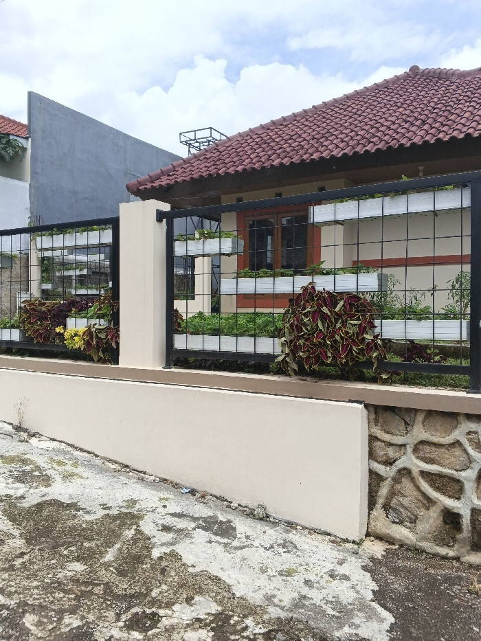 The image depicts a residential property in a city in Vietnam, location unknown. A concrete paved area, discolored with dark patches, occupies the immediate foreground. This pavement abuts a low perimeter wall, which transitions from a painted beige concrete section on the left to a rustic stone and mortar segment on the right. A brown trim caps this lower wall. Above the low wall, a black metal grid fence spans the width of the frame, punctuated by a central beige concrete pillar. Attached to this grid are numerous white rectangular planters arranged in a staggered vertical garden configuration, each containing green foliage. Below these planters, at ground level behind the fence, various plants thrive, including large clumps of Coleus with dark red and green leaves, and smaller yellow flowering plants. The main subject is a single-story house featuring a distinctive red tiled roof. The house's exterior walls are painted a light cream color, accented by a horizontal orange band beneath a central wooden-framed window or double door with dark panes. A dark metal frame structure is visible on the rooftop. To the left of the main house, a portion of an adjacent building with a plain grey concrete wall and a similar red tiled roof is visible. The sky above is partly cloudy with significant white cloud formations against a lighter blue background. No individuals are present in the scene.