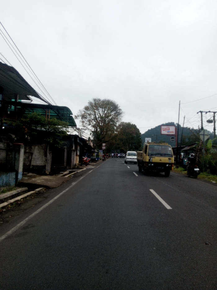 The image displays an overcast daytime street scene in Sat Thay (East), Myanmar. A two-lane asphalt road, featuring a dashed white center line, extends from the foreground into the distance. On the left side, a concrete curb delineates the road from a series of low-rise buildings, some with overhead green corrugated awnings and visible utility lines. Multiple motorcycles are parked along this section. In the mid-ground, a yellow Mitsubishi light truck with a flatbed body travels toward the viewer in the right lane, followed by a white van. On the far right, a dark motorcycle is parked on a dirt shoulder adjacent to green vegetation. The background features a large, tree-covered mountain, with a prominent red and white billboard visible at its base on the right. Several large trees, some appearing deciduous, line the road. Multiple indistinct figures and additional vehicles are visible in the distance. The sky is uniformly overcast.