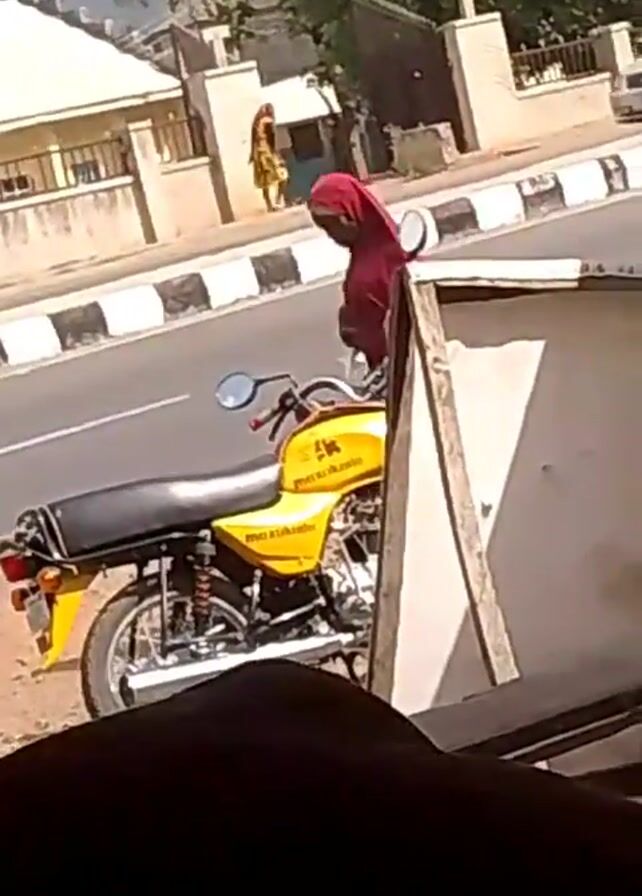 view from inside a building, looking out onto a street. A yellow motorcycle is parked beside the street. A woman wearing a red hijab and carrying a white object walks along the sidewalk. A child in white clothing walks next to her. A silver car drives by. The video is taken from a slightly low angle and has a somewhat shaky quality. A building with a white roof is visible in the background.