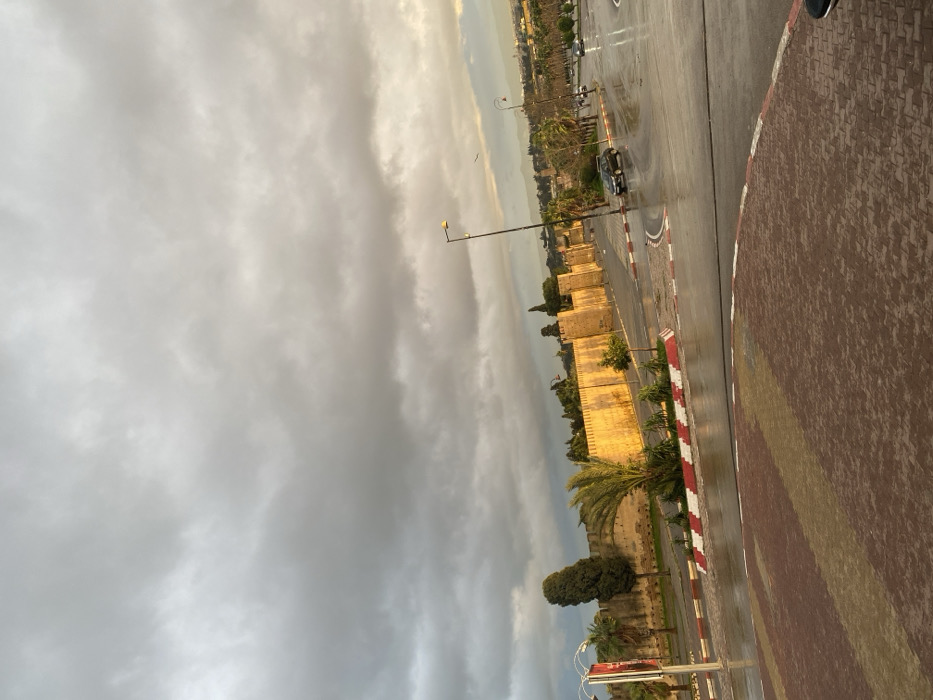 A cityscape unfolds beneath a dramatic sky of heavy clouds, possibly during or just after rainfall. An aged stone wall runs parallel to a street with wet pavement reflecting the light. The roadside is marked with a red-and-white striped barrier and tropical vegetation including palm trees. A couple of vehicles are visible on the road. The scene is illuminated with a golden hue, likely from the sun breaking through the clouds.