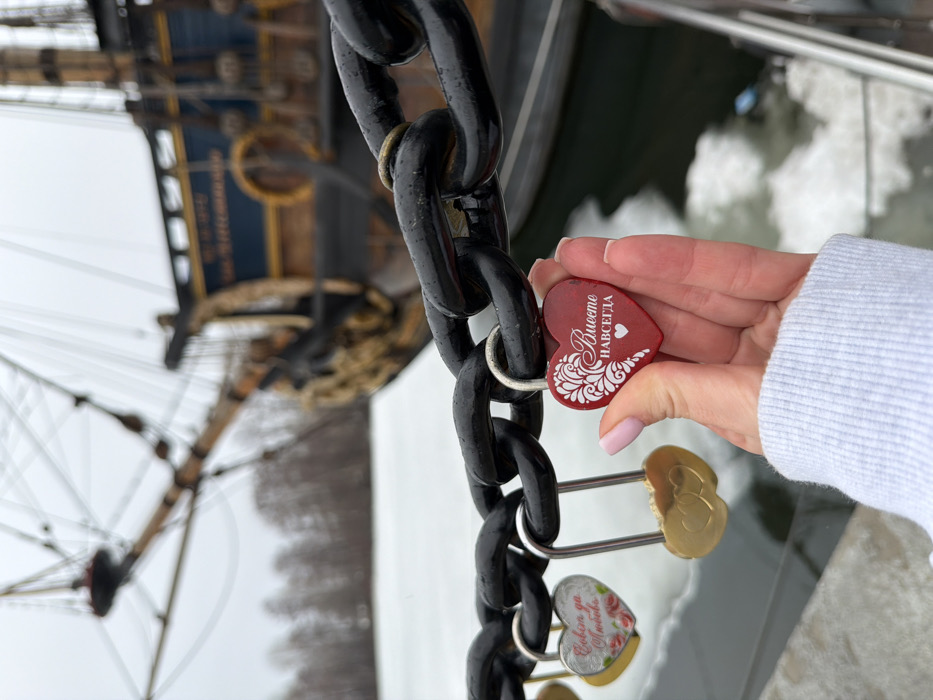 The image presents an outdoor scene in Voronezh, Russia, at the Voronezh Reservoir, with the "Goto Predestination" ship museum in the background. The foreground is dominated by a female's hand, wearing a light-colored, long-sleeved garment, touching a red, heart-shaped padlock. The padlock is inscribed with white Cyrillic text, "Вместе НАВСЕГДА" (Together FOREVER), and features white decorative scrollwork. This padlock is attached to a heavy black metal chain, which also bears several other "love locks," including a golden heart-shaped padlock embossed with two interlocking hearts and a white heart-shaped padlock with a floral design and Cyrillic text. The chain serves as a barrier overlooking the partially frozen reservoir, where a mix of ice and dark water is visible. In the background, the "Goto Predestination," a large replica 17th-century warship with a dark blue hull, gold decorative elements, masts, and rigging, is docked. A bare treeline is visible on the far shore under an overcast sky.