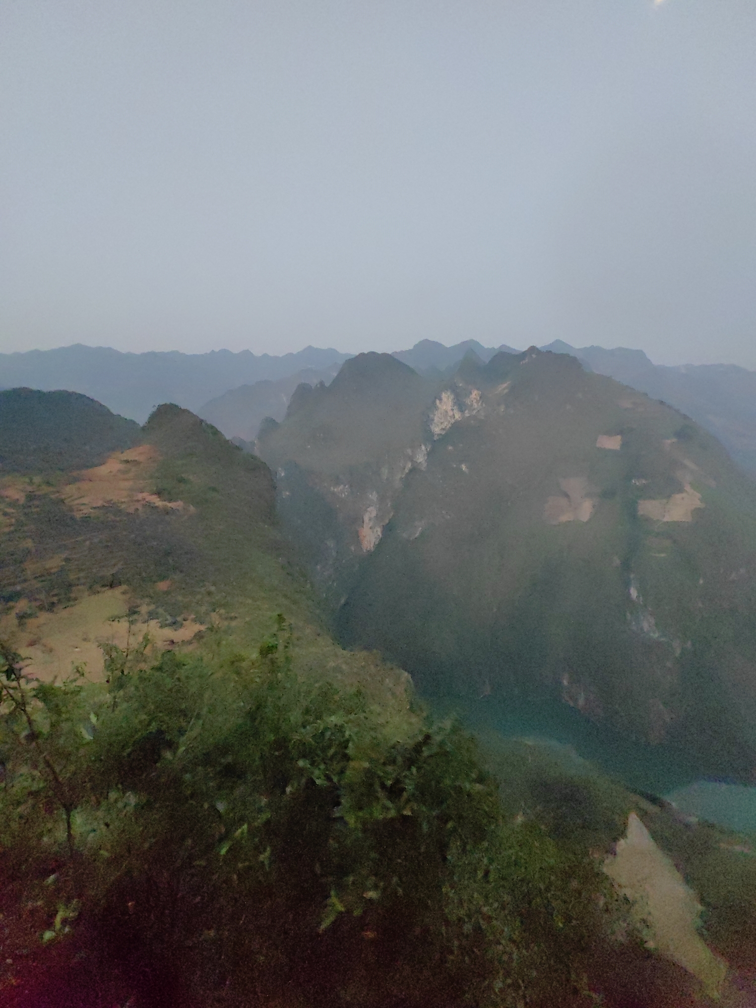mountainous landscape in the Đồng Văn Commune, Vietnam. The foreground features green vegetation, possibly bushes or small trees. The midground presents a series of layered mountains, some with visible rocky outcrops and varying degrees of vegetation cover. A body of water, possibly a river or lake, is visible between the mountains. The background is a hazy sky. The overall scene is one of a natural, mountainous environment, likely a remote or rural location.