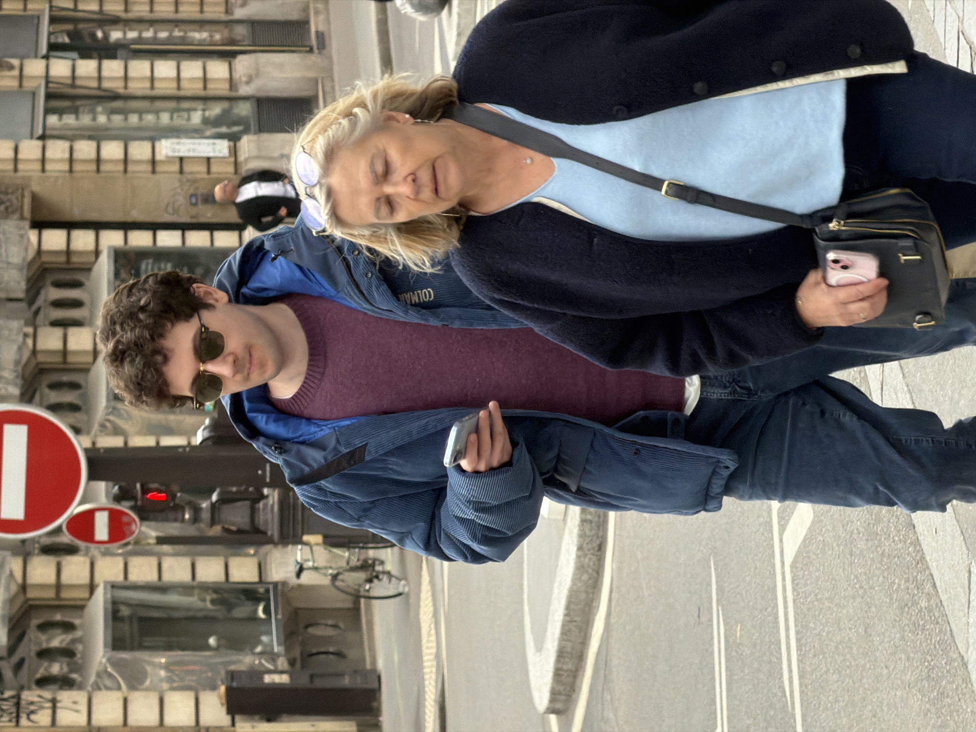 A man and a woman stand together on a street in Paris, France. The man, wearing a maroon sweater and a blue corduroy jacket, has sunglasses on. He holds a smartphone in his hand. The woman is wearing a light blue sweater, a dark blue cardigan, and carries a black purse on a strap across her body, while she holds a phone. To the left, a red "Do Not Enter" traffic sign is visible. In the background, architectural details of Parisian buildings are apparent, along with street infrastructure such as bicycles and street lights. The scene appears to be a candid moment captured on a Parisian street.