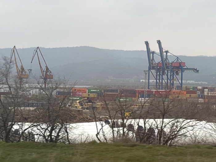 The image presents an industrial landscape in Devnya, Bulgaria, under an overcast sky