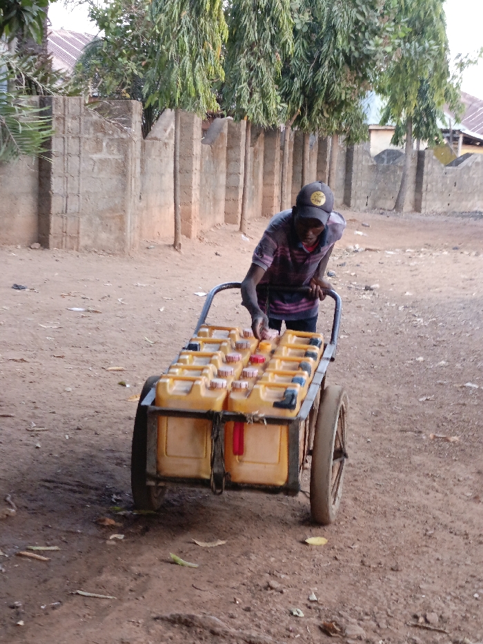 - "A male individual is observed in a slightly stooped posture, pushing a two-wheeled metal handcart laden with multiple yellow plastic jerrycans on a reddish-brown dirt path in Akwanga, Nigeria" by FM-B3Hcl1, licensed under CC BY 4.0