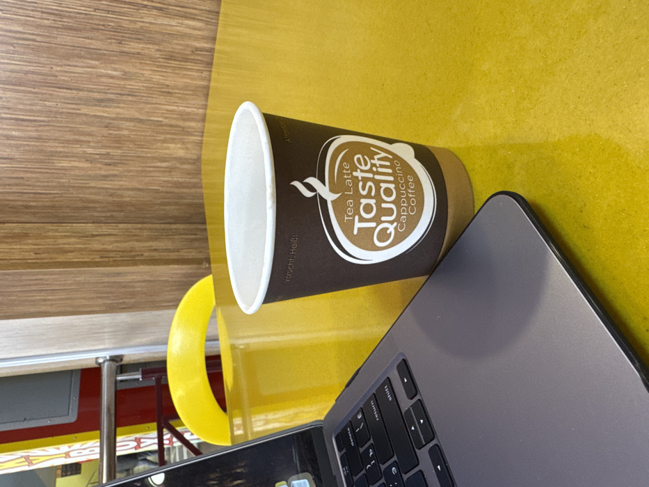 This image depicts a tabletop scene within a commercial establishment, likely a cafe or fast-food restaurant, located in Stary Oskol, Russia. On a bright yellow table surface, a brown disposable coffee cup with a white rim is centrally positioned. The cup features white text and graphics, reading "Tea Latte Taste Quality Cappuccino Coffee" and "Vorsicht: Heiß!". To the left of the cup, the lower-left portion of a silver-colored laptop computer is visible, showcasing part of its black keyboard. In the background, a curved bright yellow object, consistent with the top of a chair back, is partially visible behind the laptop. The wall immediately behind the table is covered in vertical wooden paneling. Further to the left in the background, red and yellow structural elements, including metallic railings, are discernible, suggesting a larger interior space. No individuals are present in the frame, and no specific actions or interactions are depicted.
