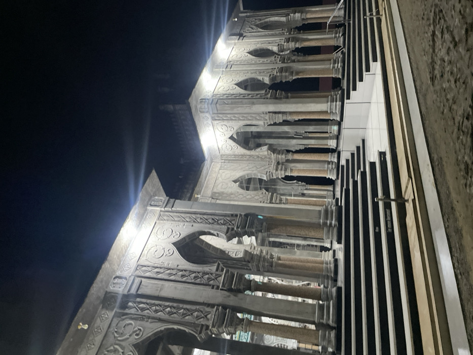 The image displays an ornate, multi-arched and columned architectural structure illuminated at night in Triengmeuduroe, Indonesia. The building, likely a mosque or religious complex, features numerous grey-toned columns with reddish-brown lower sections, supporting pointed arches. The arches and the rectangular panels between the columns are extensively decorated with intricate relief carvings of floral and geometric patterns. Bright white artificial lights are mounted along the structure, illuminating its exterior and casting distinct light rays upwards into the dark, clear night sky. A series of tiered steps with black treads and white risers leads up to the structure from the foreground, with a central ramp or wider stair section visible. The immediate foreground consists of dark, uneven ground, likely dirt or rough pavement. No individuals or discernible activities are present within the scene.