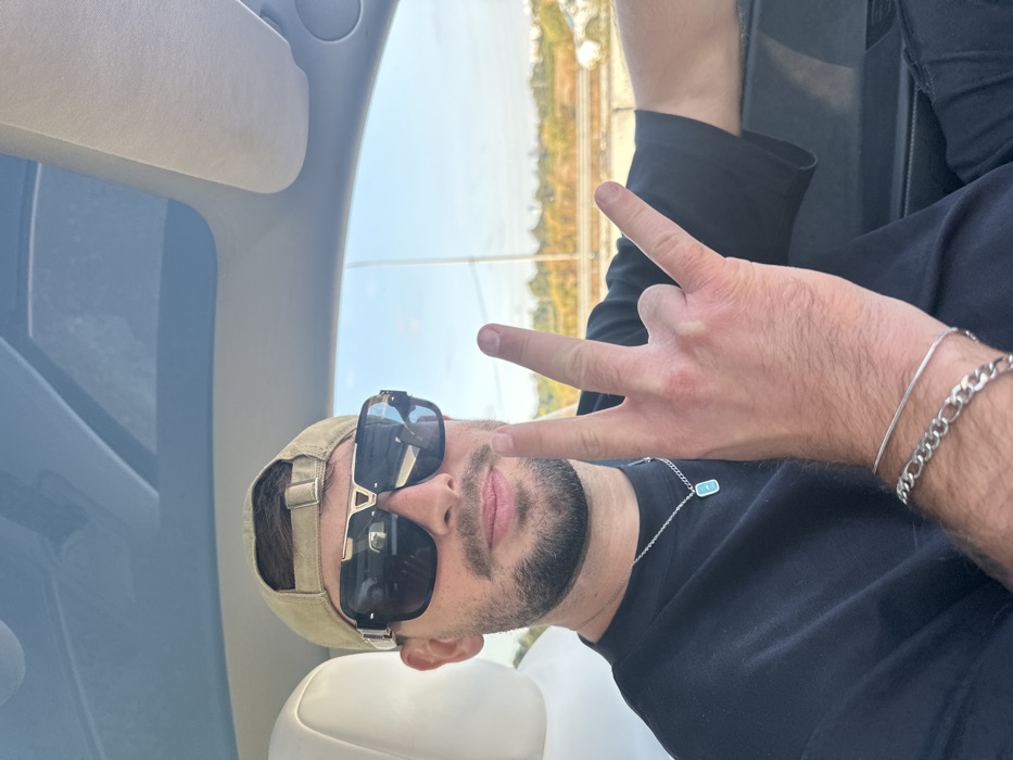 A male individual is depicted in the driver's seat of a vehicle in Petah Tikva, Israel. He is estimated to be in his late 20s to early 30s, with short dark hair, a trimmed beard, and light skin. The man is wearing a beige baseball cap backward, dark oversized sunglasses with gold-colored accents, and a black crew-neck t-shirt. A silver-colored chain with a light blue rectangular pendant is visible around his neck. On his left wrist, he wears two silver-colored bracelets: one a Cuban link style and the other a thinner snake chain. He is looking directly at the camera with a slight smile. His left hand is raised to chest height, forming a hand gesture with the index, middle, and ring fingers extended, while the thumb and pinky are folded. The vehicle interior features light-colored seating and a tinted panoramic sunroof. Beyond the vehicle's windows, a clear blue sky is visible above a roadside environment characterized by dense, dry-looking vegetation. A utility pole stands vertically on the right side of the exterior view, and a distant road with a partially visible light-colored vehicle suggests a highway setting.
