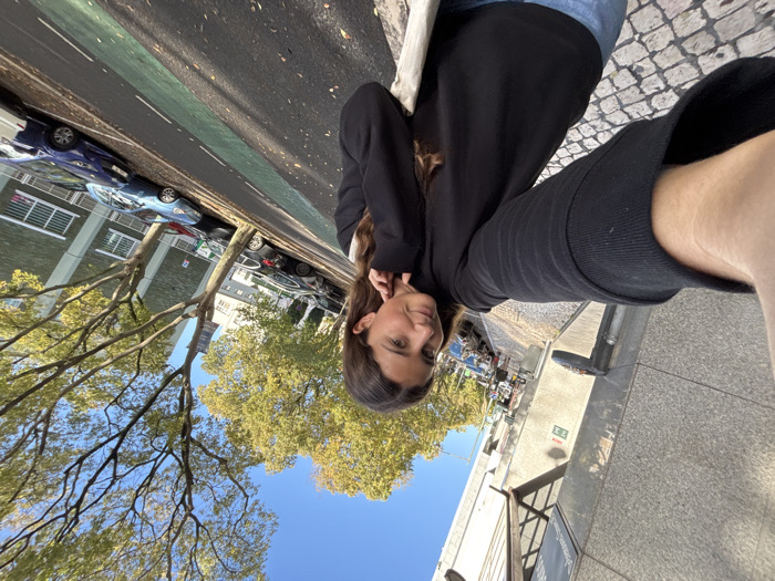 This is a daytime, outdoor selfie taken on an urban street in Lisbon, Portugal, identifiable by the distinctive patterned Portuguese pavement (Calçada Portuguesa) visible in the foreground. The primary subject is a female individual, positioned in the foreground and center-left, facing the camera with a slight smile. She has long, dark brown hair and is wearing a black long-sleeved sweatshirt and light blue jeans. Her right arm is extended, holding the camera, with her hand partially visible in the bottom left corner. Her left hand is casually placed near her neck or shoulder. To the left of the subject, the sidewalk features geometric patterns of light and dark stone. A building facade, clad in light grey granite or stone, runs parallel to the sidewalk. A black pole is visible, along with a red square sign displaying the number "23" and green symbols. Faint text, possibly "Salgados," is partially visible on the building under an awning structure. To the right of the subject, an asphalt road extends diagonally into the background, featuring a distinct green-painted bicycle lane with white markings. Multiple vehicles, including sedans and hatchbacks of various colors (blue, silver, dark grey), are parked bumper-to-bumper along the right side of the street. The background reveals a row of multi-story buildings with various architectural details, typical of an urban setting. Numerous mature trees with dense, yellowish-green foliage line the street, suggesting autumn. The sky above is clear and bright blue, indicating sunny weather. The lighting is bright, casting some shadows on the road and pavement. Other indistinct human figures are visible on the distant sidewalk in the background.