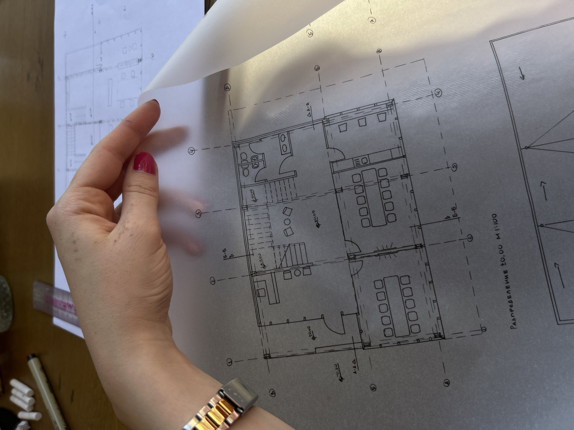Here is a detailed description of the image: **Scene:** The image depicts a person holding up a transparent sheet over a blueprint. The blueprint shows a floor plan of a building. The drawing includes details like walls, doors, windows, furniture layouts, and dimensions. There are alphanumeric grid markers surrounding the plan. On the lower right corner of the blueprint, there's a written text "РАЗПРЕДЕЛЕНИЕ ±0,00 M 1:100", likely indicating the distribution layout and scale (1:100). A different building is on the other paper left to the main plan. **People:** Only a hand and a wrist with a watch are visible. The hand is holding the transparent sheet. The fingernails have a red polish. **Objects:** * Blueprint: The central focus of the image, detailing the architectural plan. * Transparent sheet: Held over the blueprint. * Pen, markers, and ruler: Located on the table * Watch: On the person's wrist. **Actions:** The person is in the process of comparing/layering the transparent sheet over the blueprint. **Environment:** The scene is indoors, possibly in an office or architectural studio.