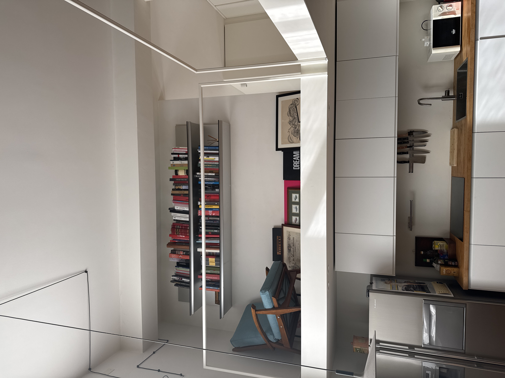 The image captures a modern interior, potentially within an apartment in Milan, Italy. The scene features a minimalist aesthetic with a primarily white color palette. Dominating the right side of the image is a section of a kitchen with white cabinetry, a stainless-steel sink, and a small microwave. To the left, there is a bookshelf stocked with numerous books and a blue upholstered chair. The lighting is provided by long, linear light fixtures. The overall impression is one of a carefully designed and maintained living space.