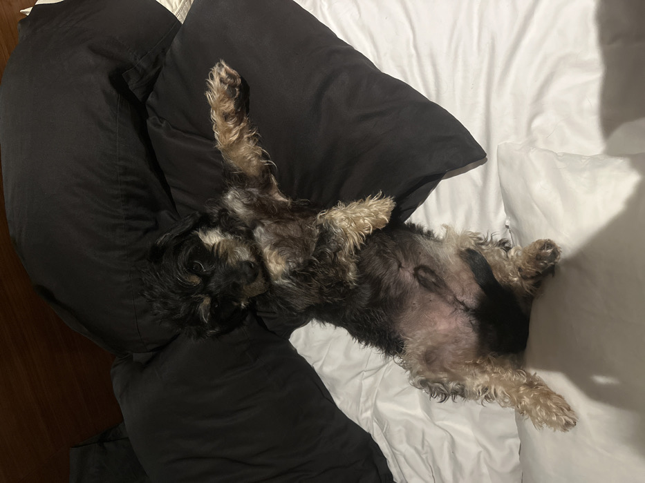 - "An overhead image depicts a small, shaggy-haired domestic dog, predominantly dark brown and black with tan and light brown fur on its belly and extremities" by FM-zAP4P2, licensed under CC BY 4.0