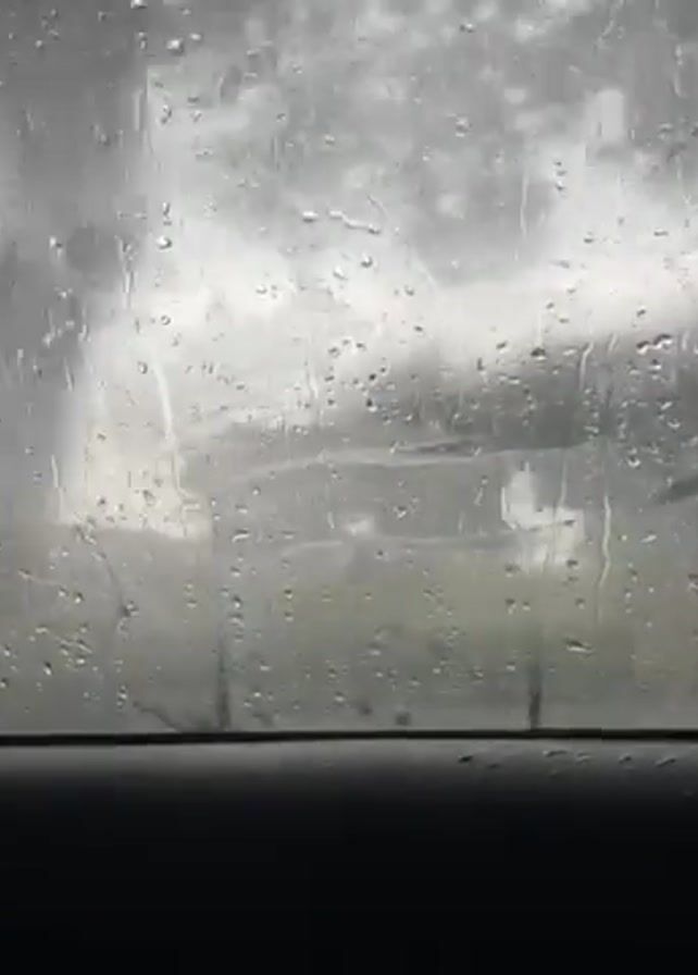 view through a car window during heavy rain. Raindrops cover the glass, obscuring the outside view, but it is possible to make out the shapes of buildings and palm trees. The sky appears overcast. The lower part of the window frame is visible, in dark gray. A child's cloud drawing is stuck to the window. It sounds like someone is talking in the car, but their voice is indistinct.