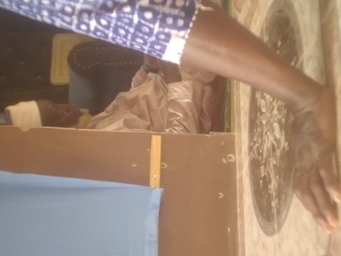 The image depicts an indoor scene in Idimu, Nigeria, focusing on a multi-plane view. In the immediate foreground, a dark-skinned right arm and hand are visible. The hand is splayed flat on a light-colored tiled floor featuring a circular, dark patterned motif. The arm wears a blue and white patterned sleeve, suggesting a fabric garment. To the left, a light blue fabric or curtain hangs partially into the frame, obscuring part of a brown wooden partition or doorway. Beyond this partition, in the midground and background, an elderly dark-skinned male is seated. He wears a white cap (kufi) and a light-colored, possibly cream or beige, traditional garment. His gaze is directed downwards and slightly to his right. A dark upholstered chair is partially visible behind him, and a green mat is positioned on the floor beneath him. The overall environment suggests an interior space, possibly a residence or formal room, with tiled flooring and ambient lighting.