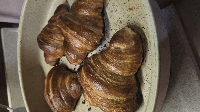 - "The scene depicts four freshly baked, golden-brown croissants arranged within a light-colored, possibly ceramic or stoneware, round baking pan" by FM-tgCpu2, licensed under CC BY 4.0