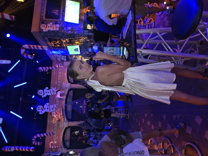 A woman in a white dress stands in a nightclub, smiling. Decorations include giant candy canes, gingerbread men, and blue lights. Monitors show various scenes. Other people can be seen in the background, seated at tables and milling around. The club appears to be celebrating Christmas.