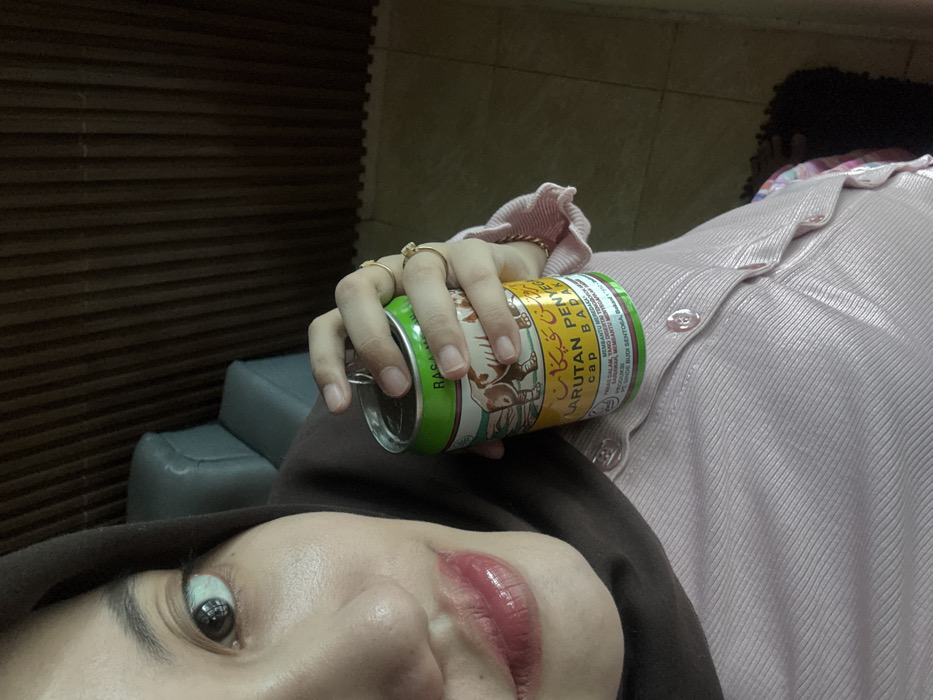 A young adult female is depicted in a close-up, indoor shot from the city of Gadingrejo, Indonesia. She is wearing a dark brown hijab and a light pink ribbed long-sleeved top. Her left eye, with a visible reflection, is directed towards the camera, and her lips are glossy with a pink tint. Her right hand, adorned with two gold-colored rings on the ring and middle fingers, holds an open green and yellow aluminum beverage can of "Larutan Penyegar Cap Badak" (Rhino Brand Cooling Solution). The can's label features a rhinoceros illustration and Indonesian text. The background consists of a dark brown, vertically ribbed wall panel to the right, and a light grey upholstered armrest of a chair or couch to the left. The lower right portion of the image shows light-colored tiled flooring with a dark patterned mat.