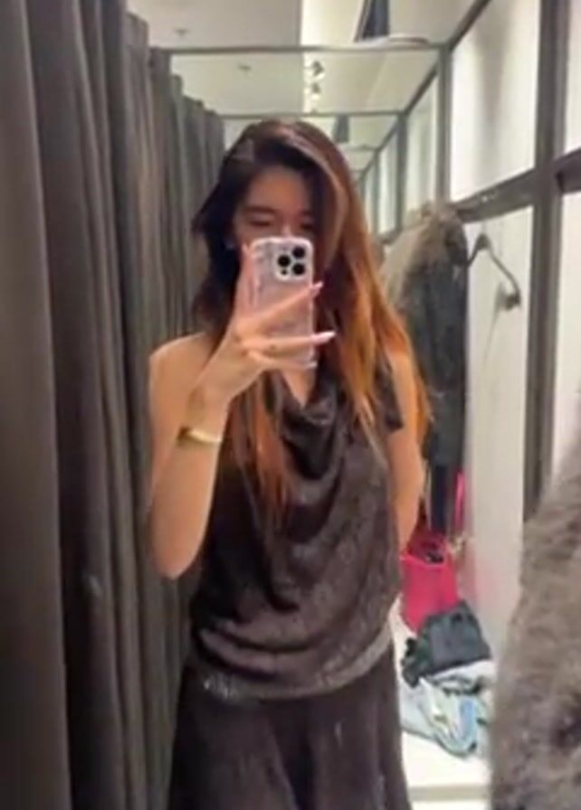 A woman is taking a selfie in a clothing store dressing room