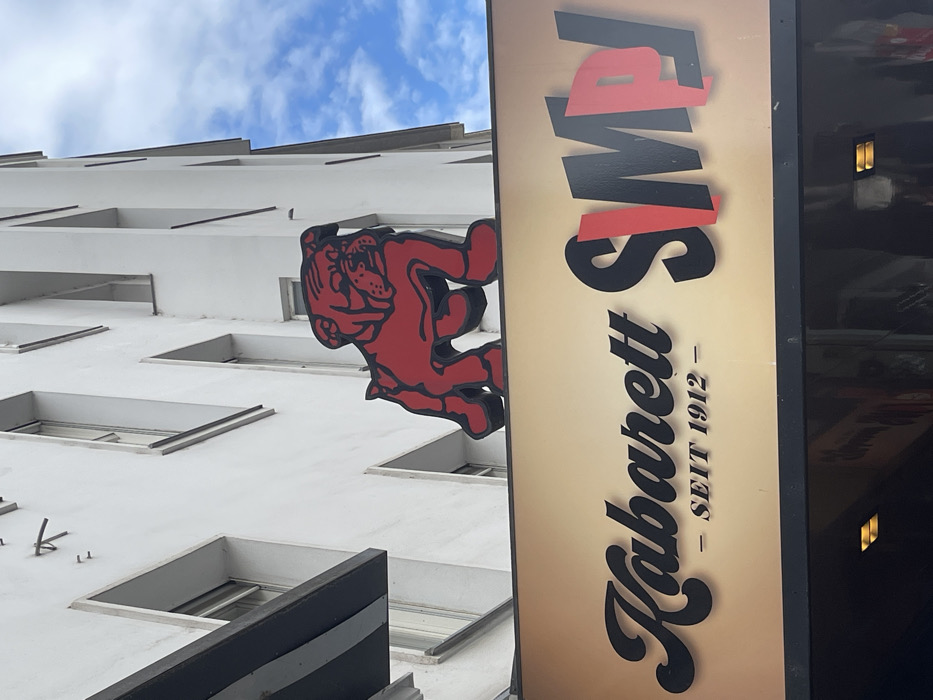The image depicts the upper facade of a building housing Kabarett SIMPL, located at Weihburggasse 6-8, 1010 Vienna, Austria. A prominent sign spans the lower-middle, displaying "Kabarett" in black cursive script, followed by "- SEIT 1912 -" in smaller black sans-serif text. To the right, "SIMPL" is rendered in stylized, fragmented black and red sans-serif characters. Directly above this sign, a large, two-dimensional red bulldog figure with black outlines stands, facing towards the right. The building's multi-story white facade rises above the sign, featuring multiple recessed rectangular windows with dark frames. A dark-colored awning is partially visible on the upper left side. The upper right portion of the scene reveals a cloudy blue sky. Below the main sign, reflections of interior lighting are visible in a dark, glossy surface.