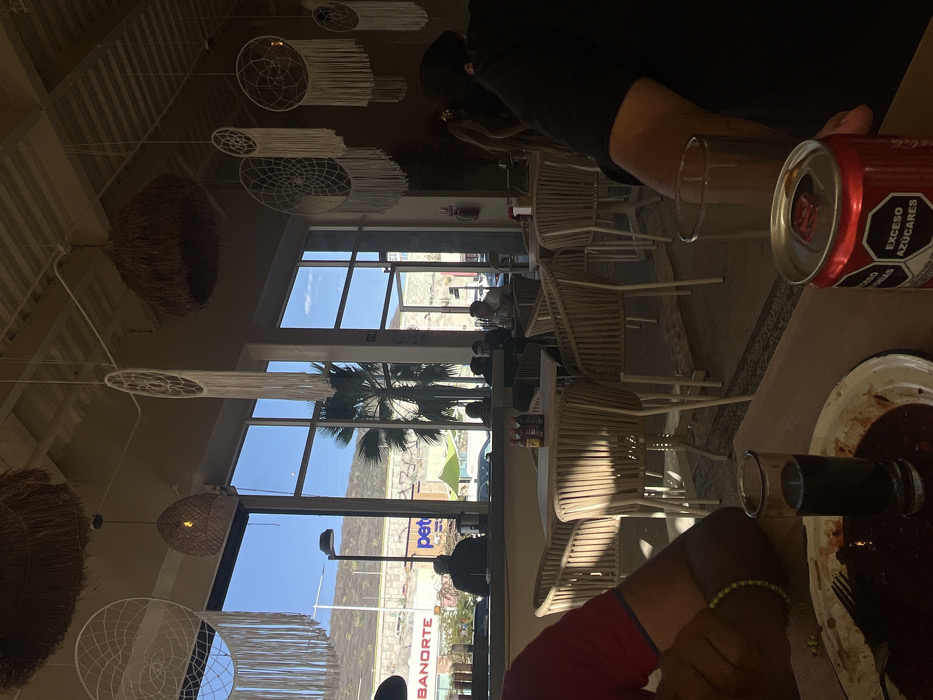 The image depicts an interior view of a restaurant or cafe, looking out through large windows onto an urban street scene during daylight hours. In the immediate foreground, a light-colored table is visible, featuring a white plate with dark, reddish-brown food remnants and a metal fork. Adjacent to the plate, a clear shot glass contains a dark liquid. To the right, an open red aluminum can, branded with white text including "EXCESO AZÚCARES" (Excess Sugars) and "Coca-Cola," rests on the table. The left foreground shows the arm and shoulder of an individual wearing a red shirt and a light-colored bracelet. The right foreground shows the back and shoulder of another person in a dark shirt, with a clear drinking glass in front of them. The restaurant's interior features a modern design with numerous light-colored, woven-back chairs surrounding square tables. Overhead, the ceiling is adorned with multiple hanging decorative elements, including various white, woven dreamcatchers of different sizes with long tassels, and several basket-like light fixtures made of natural fibers. Further back in the dining area, several indistinct figures are seated at tables, partially obscured by shadow and distance. Beyond the restaurant's large, multi-pane windows, a bright urban environment is visible. The exterior scene includes a street with vehicles. Across the street, commercial buildings display prominent signage: a red "BANORTE" logo for a bank and a blue "Petco" logo for a pet supply store. A tall streetlamp stands visible outside. In the mid-distance, a large palm tree is seen. The background consists of treeless, undulating hills under a clear blue sky. Based on the distinctive commercial signage (Banorte, Petco) and the hilly urban landscape, the location is identified as being in the vicinity of Plaza Constituyentes on Av. Constituyentes Ote. in Santiago de Querétaro, Mexico.