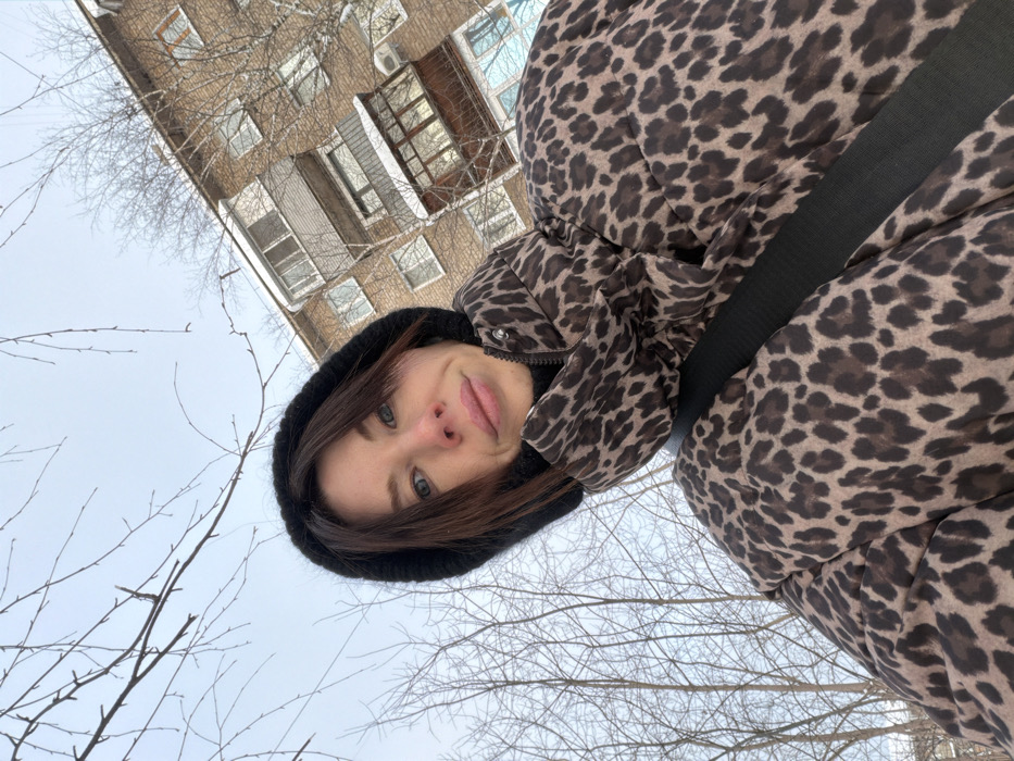 The image displays a low-angle, upward-facing shot of a female individual outdoors in a residential urban environment. The subject, a woman with fair skin, blue eyes, and dark brown hair, is wearing a black knitted hood that partially covers her head and a prominent brown and black leopard-print puffer jacket. A black strap, consistent with a bag or camera strap, is visible across her right shoulder and upper chest. Her gaze is directed towards the camera, suggesting a self-portrait. The background consists of an overcast, light grey sky dominating the upper frame, indicative of a winter or early spring day. Numerous bare deciduous tree branches are visible across the upper left and central portions of the image. In the upper right quadrant, a multi-story residential building, constructed of light brown brick, is present. This building features multiple rectangular windows with white frames and several enclosed balconies, some appearing to have dark wooden elements, and at least one external air conditioning unit. The architecture of the building and the bare trees are consistent with typical urban landscapes in Russian cities during colder months. While the environment is indicative of a residential area within a city like Perm, Russia, the precise street address or specific location within Perm cannot be determined from the visual data alone. The overall scene depicts a standard winter day setting in a Russian urban residential zone.