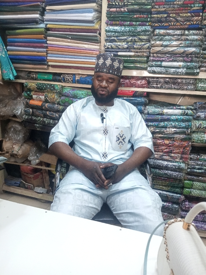 The image depicts an indoor scene within a fabric shop in Rigasa, Nigeria