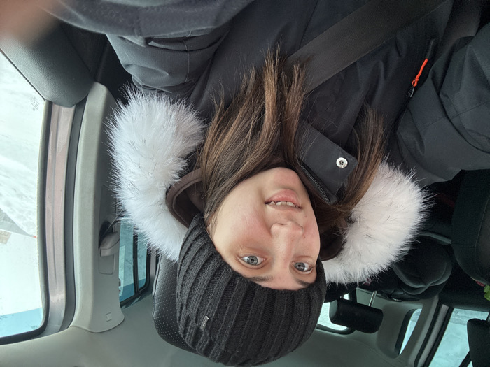 A female individual is seated in the front passenger seat of a vehicle, captured in a selfie-style close-up photograph