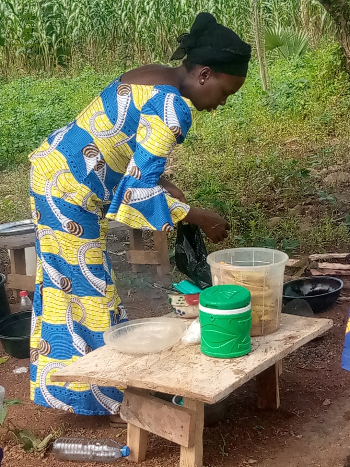 In Agban, Nigeria, an outdoor scene depicts a dark-skinned female, dressed in a vibrant yellow and blue patterned long dress and a black headwrap, bending forward over a wooden makeshift table